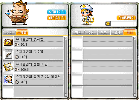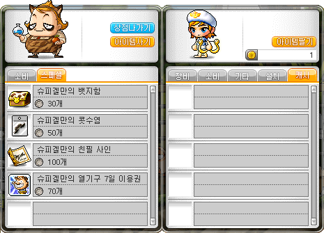 The first item is Spiegelmann’s Badge Box, which you can open for a badge with randomized stats. There can be str, dex, int, luk, attack, magic attack, speed, jump, basically any stat. You can get a Bronze, Silver, or Gold badge. The better the quality, the higher the stats can go. They last for 7 days.