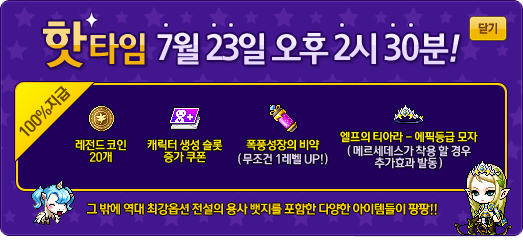 The second Hot Time event’s prizes have been announced! Be logged on at 2:30 pm on July 23 and you will get (for sure) 20 Legend Coins, a Character Slot Coupon, a Level Up Vial, and an Elf’s Tiara! The Legend Coins can be spent at the Shop of Legend, the Character Slot Coupon gives you a free character slot, and the Level Up Vial levels you up once!