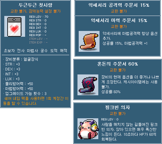 • 7 days: Exciting First Love (face accessory, 3 to all stats, 50 defense and magic defense, 3 slots, can be traded through the account once through the use of the Share Name Tag)