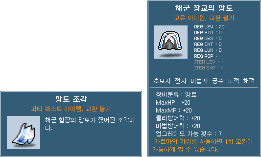 •  Navy Captain’s Cape: level 105 req, 4 to all stats, 80 HP and MP, 45 defense and magic defense, 7 slots (untradeable)