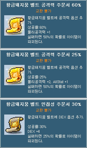 • 25% Golden Pig Belt for Attack/Magic Attack scrolls (+2 attack/magic attack, +1 all stats, 50% chance of destroying the item if failed)