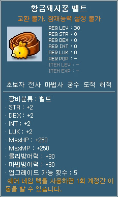 • Golden Pig Belt (2 to all stats, 250 HP and MP, 30 defense and magic defense, 5 slots, can be traded through the account once with the Share Name Tag)