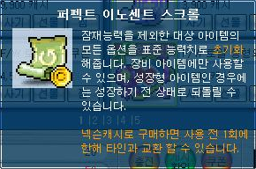 As for Cash items, there are three new ones that are very special! One is called the Perfect Innocent Scroll. It completely resets an items stats, enhancements, and potential, back to a clean item. It is a 100% version of the Innocent Scroll that came out a few patches ago.