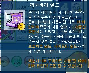 Another new item is the Recovery Shield. It can be used on an item to give it the Recovery status. When a scroll is used on that item and it fails, the scroll will be returned to your inventory instead of disappearing! However, if it passes, the status will go away and you will have to use another Recovery Shield if you want the effect. It can be used with the Protect Shield and Safety Shield Cash items.
