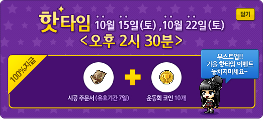 This event also brings two new Hot Time events! The first was on October 15, and the second is on October 22. If you are logged in at 2:30 pm, you will receive a Teleportation Scroll and 10 Sports Meet Coins.
