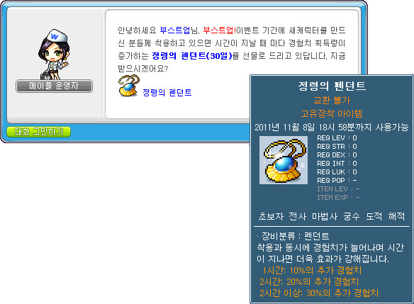 The Boost  Up event is made for people new to MapleStory, as well as people creating new characters! Every new character created during the event receives a free 30 day Pendant of the Spirit, for easier levelling~