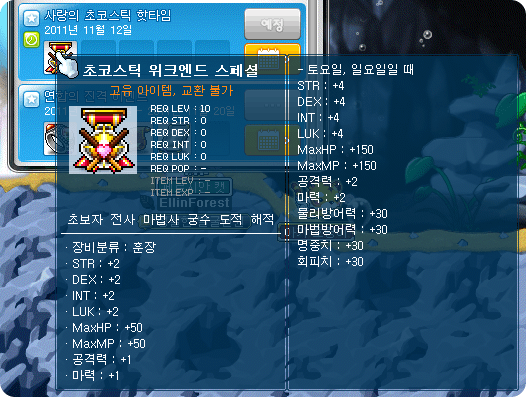 Normally it gives 2 to all stats, 50 HP and MP, and 1 attack and magic attack. But, on the weekends, it gives (in total), 6 to all stats, 200 HP and MP, 3 attack and magic attack, and 30 defense, magic defense, accuracy, and avoid. However, it is time limited (don’t know how long it lasts yet) and cannot be time extended.
