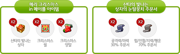 First off, the chance of getting Santa’s Shiny Boxes, Christmas Seals, and Magical Christmas Stockings has been increased 2x! Also, you will 2 times the Snowball Scrolls from the boxes~