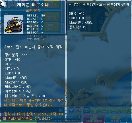 It can potentially give out many items, including the Raven Persona, the trademark hat of Phantom! It gives 10 to all stats, 200 HP and MP, 50 defense and magic defense, with 10 slots. It can be traded through storage with the Share Name Tag. If you are a 3rd or 4th job Phantom, you’ll also receive a bonus of 10 dex and luk, 30% MP, and 5 attack! This is a 100% prize I think, since it’s very similar to the Devil Horns, Elven Tiara, and Counterattack Goggles.