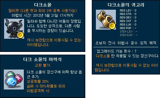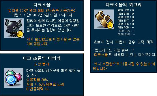 • Dark Soul (pet, lasts 90 days, is a multipet, comes with Meso Loot, untradeable, cannot be moved into the Cash wardrobe)