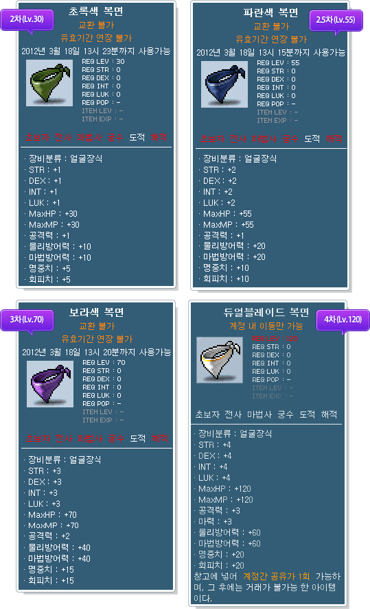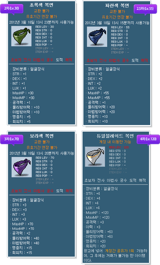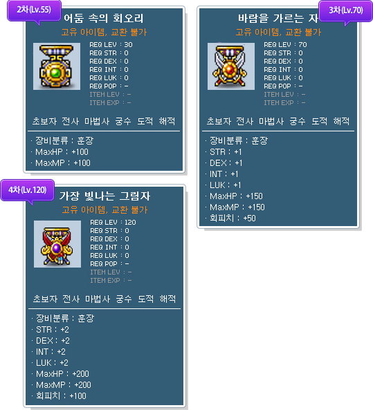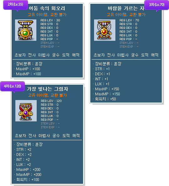 Dual Blade’s advancement system has also been changed: Level 10 – 1, Level 20 – 1.5, Level 30 – 2, Level 55 – 2.5, Level 70, 3, Level 120 – 4! At fourth job, Dual Blades can receive a special mount called the Dark Owl.