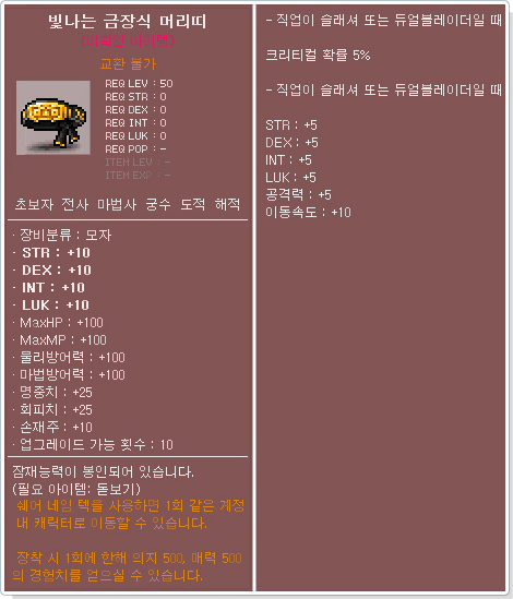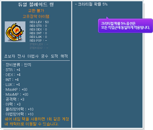 All newly  created Dual Blades that reach level 50 receive the Dual Blade Ring! It gives 4 to all stats, 80 HP and MP, 3 attack and magic attack, 10 defense and magic defense, and 5% critical chance! It is tradeable through the account with the Share Name Tag!