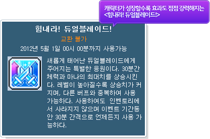 • Level 10/20/30: Dual Blade Level Equipment Box, <Go! Dual Blade> buff coupon