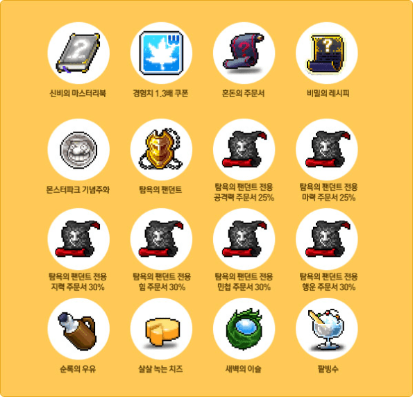 • Pendant of Greed Scrolls (25% attack/magic attack scrolls with a 25% chance to explode if failed and 30% stat scrolls)