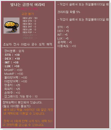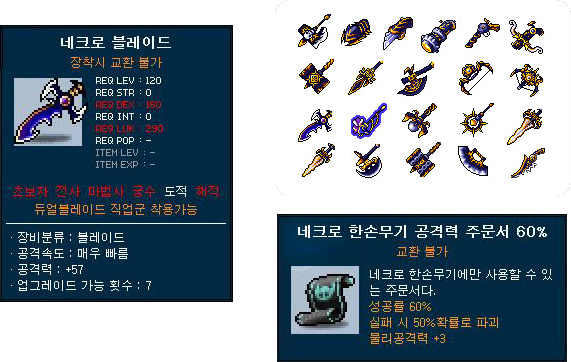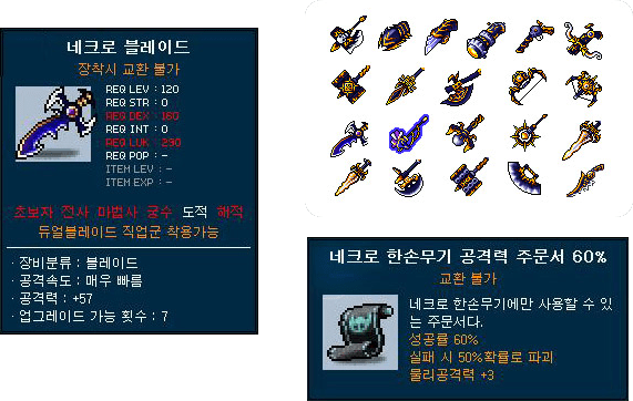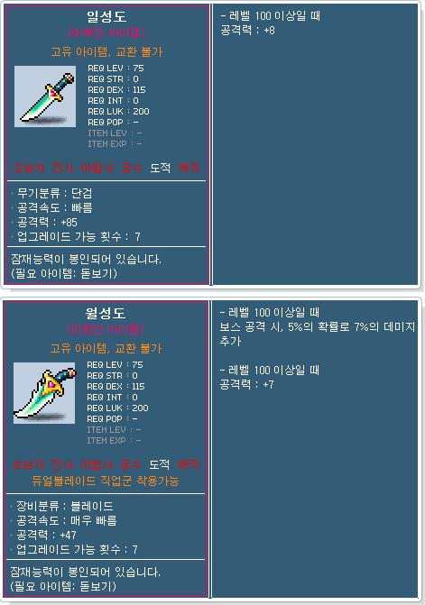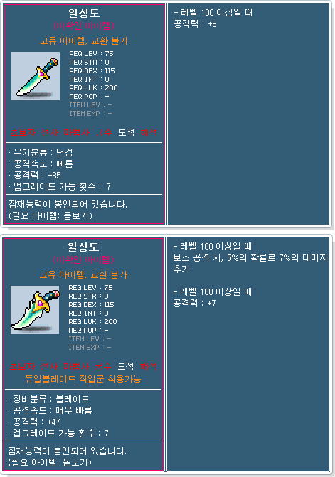 All newly created Dual Blades that reach level 75 receive a free level 75 dagger and blade! They come unidentified, and also have special effects! When you are level 100 or more, the dagger gives an extra 8 attack, and the blade gives a 5% chance to hit 7% extra damage on a boss monster and 7 extra attack.