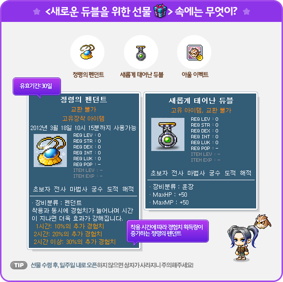All newly created Dual Blades receive a special gift, which contains three items. The first is a 30 day Pendant of the Spirit, the Newly Born Dual Blade medal, and the Owl Effect Cash item!