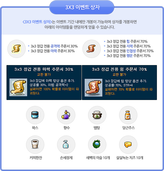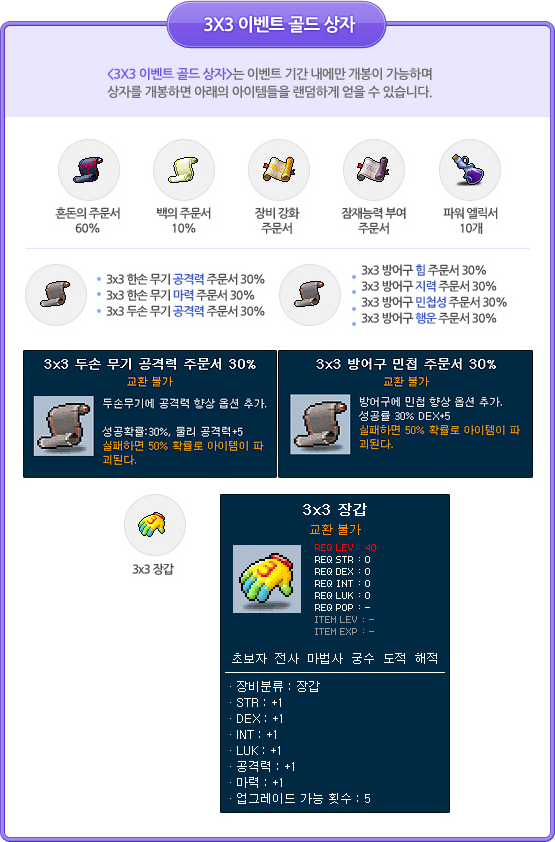 - 30% 3×3 Glove-only Attack/Magic Attack Scroll (can only be used on the 3×3 Gloves, gives 2 attack/magic attack, if failed destroys the item)
