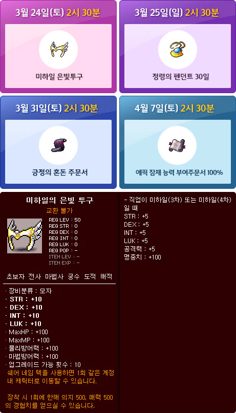 There’s also some Hot Times coming up! On March 24, you get Mikhail’s Silver Helmet. It gives 10 to all stats, 100 HP and MP, defense and magic defense, with 10 slots. It can be traded through the account with the Share Name Tag. If you’re a 3rd or 4th job Mikhail, you get an extra 5 to all stats, 5 attack, and 100 accuracy.