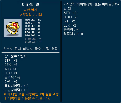 At level 50, they receive the Mikhail Ring! It gives 3 to all stats, 2 attack and magic attack, and 10 defense and magic defense. It can be traded through the account once with the Share Name Tag. However, if you are 3rd or 4th job Mikhail, you receive a bonus 2 to all stats, 1 attack, and 100 accuracy.