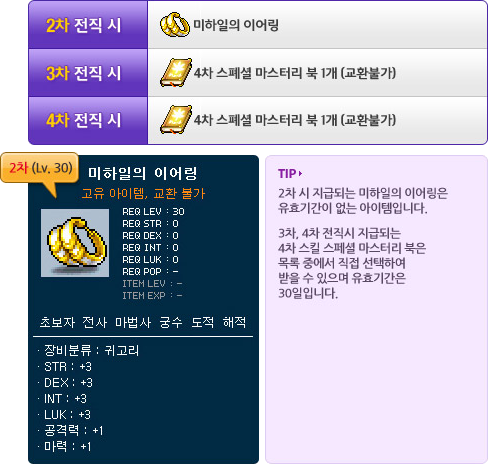 At second job advancement, you receive the Mikhail’s Earrings, which give 3 to all stats, 1 attack, and 1 magic attack. They are untradeable and have no slots at all. At third and fourth job advancements, you get a Special Mastery Book of your choice (so yes, total of 2). They expire in 30 days though.