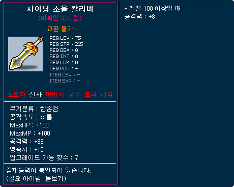 At level 75, they receive the Shining Soul Caliber! It is untradeable and gives 88 attack (fast speed). It comes unidentified. If you’re level 100 or more, you get an extra 8 attack!