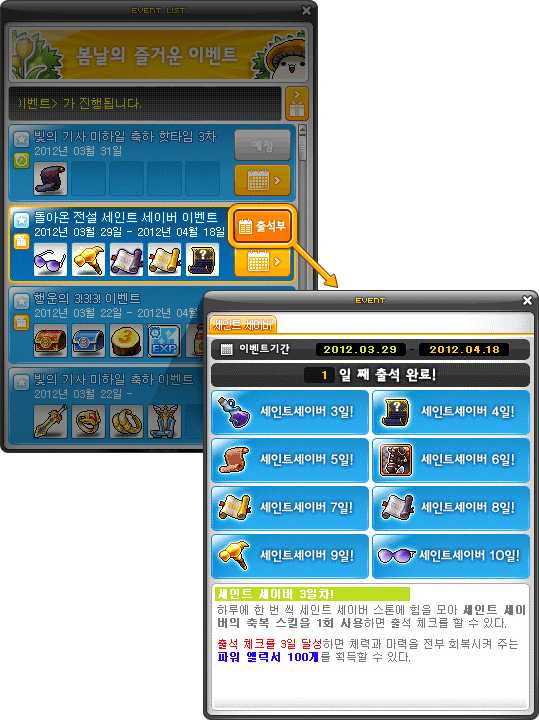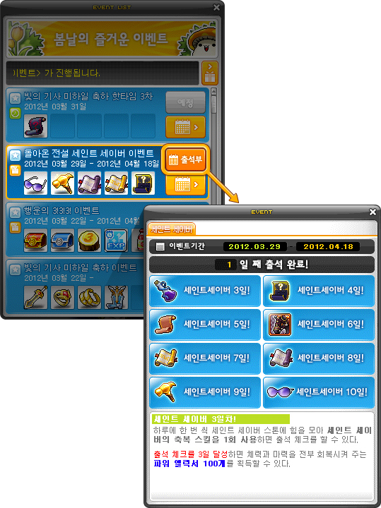 • 10 days: Saint Saver’s Goggles (4 to all stats, 30 defense, magic defense, accuracy and avoid, 5 slots, untradeable, cannot have potential, can be traded through the account with the Share Name Tag)