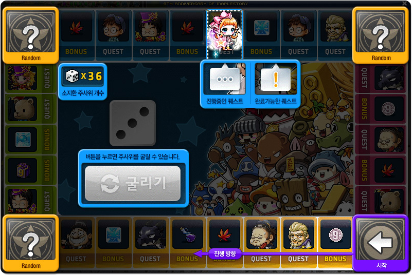 If you land on a Bonus space, you’ll get free items (either leaves, Power Elixirs, 1.5x drop or experience coupons, 9th Anniversary Boxes and 9th Anniversary Coins)! If you land on a Quest space, you’ll get a quest from an NPC that rewards you with coins! And if you land on a Random spot, you’ll randomly get one of the above prizes~ For passing Go, you’ll get 5 free coins!