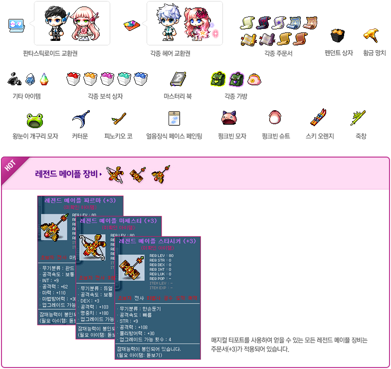 - Various scrolls (Clean Slate, CHaos, Innocence, Protect, Safety, Enhancement, Potential, 9th Anniversary)