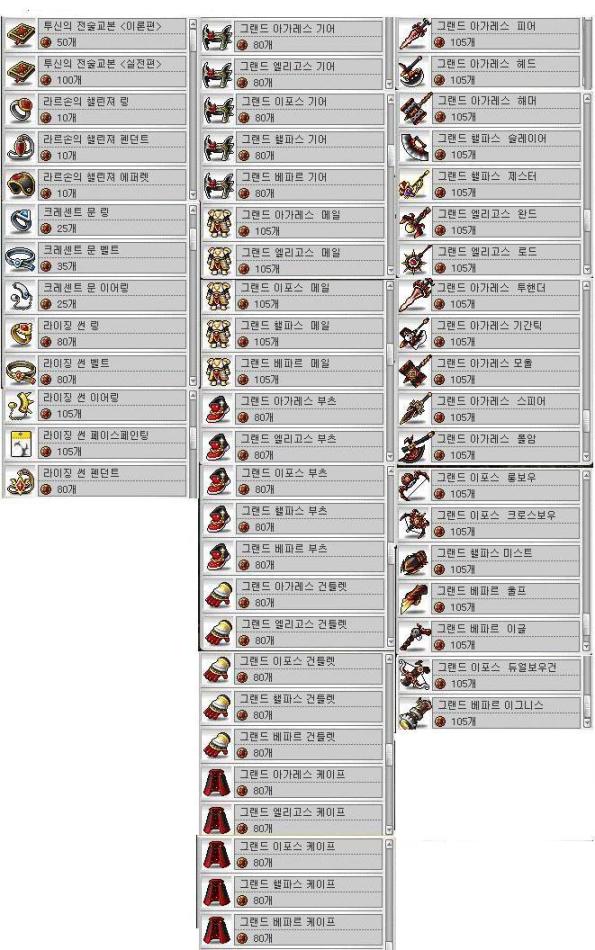 Larson has updated his shop, he now sells premade equipment, including the Challenger set, the Crescent Moon set, and the Rising Sun set. He also sells the new Grand set, which are level 130. You can see the stats here (thanks Fiel!).