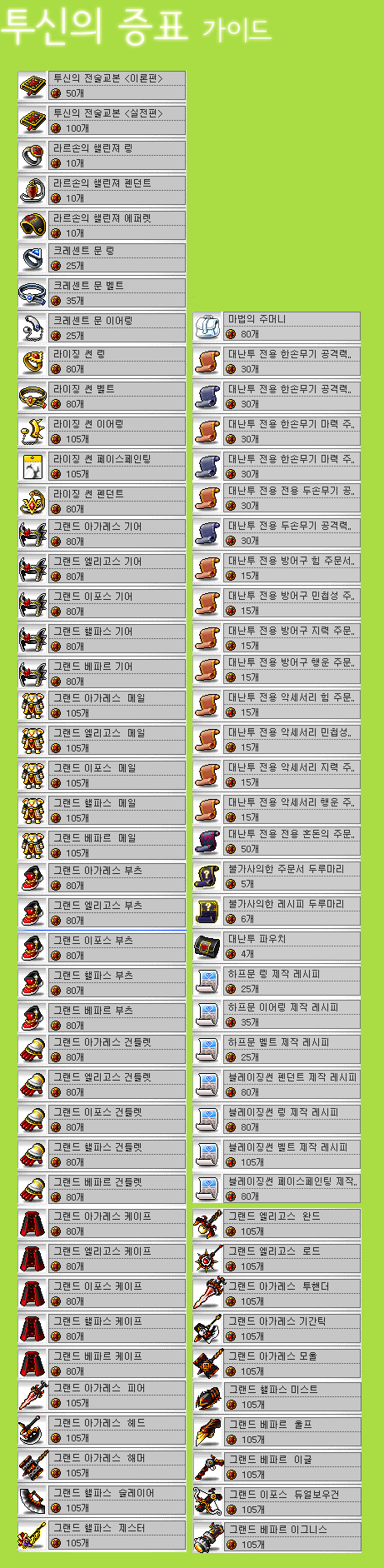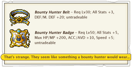 • Bounty Hunter Badge: Req Lv: 50, STR/DEX/INT/LUK +5, Max HP/MP +200, ACC/AVOID +10, Speed +5, grants additional +5 to STR/DEX/INT/LUK and +3 to Weapon/Magic ATT to the upcoming GMS exclusive character. A Sharing Tag is required to move it within the account.