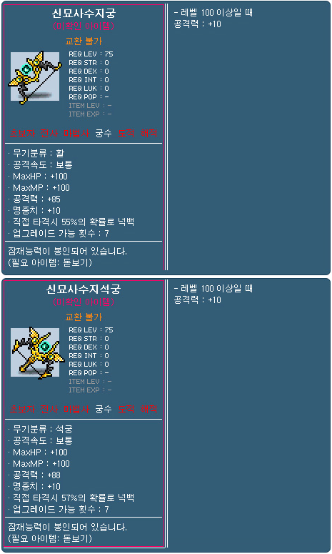 The Fearful Archer Bowwhich gives 100 HP and MP, 85 attack, 10 accuracy with 7 slots. If you’re level 100 or more, you’ll get an extra 10 attack.