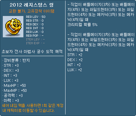 Newly created Resistance characters that reach level 50 will receive the 2012 Resistance Ring, which gives 3 to all stats, 50 HP and MP, and 3 attack and magic attack. If you are a 3rd or 4th job Battle Mage, Wild Hunter, or Mechanic, you’ll receive an extra 5% critical chance and 2 to all stats.