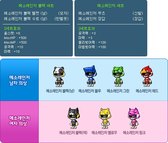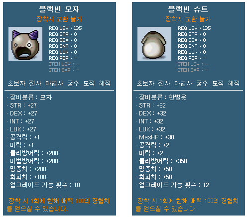 • Black Bean Hat and Suit, when worn together you will receive a set effect (3 attack and magic attack, 200 accuracy and avoid, 15% HP and MP, 5 all stats)