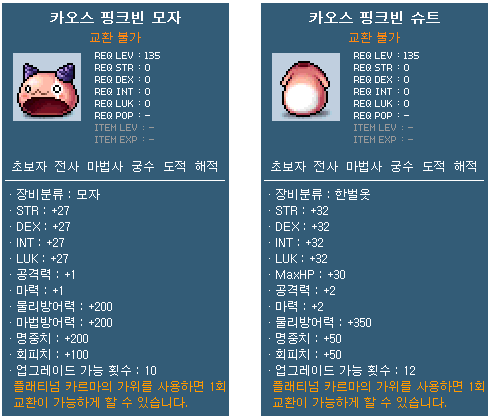 • Chaos Pink Bean Hat (27 all stats, 30 HP, 200 def, m. def, and accuracy, 100 avoid, 1 attack and magic attack, 10 slots,  level 135, untradeable when equipped, PSoK required after equipping) and Suit (32 all stats, 350 def, 50 accuracy and avoid, 2 attack and magic attack, 12 slots,  level 135, untradeable when equipped, PSoK required after equipping) , when worn together you will receive a set effect (1 attack and magic attack, 200 accuracy and avoid, 15% HP and MP, 3 all stats)