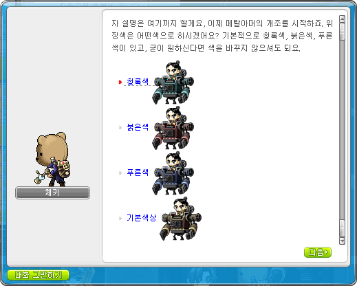 A new skill has been added for Mechanics that allow them to change the colour of their metal armor. You must use the Metal Armor Conversion Chip, that can be bought from Checky for 1m mesos. It will then randomly change your metal armor’s color! There are more colours in addition to the ones above, such as green, yellow, pink, and purple~