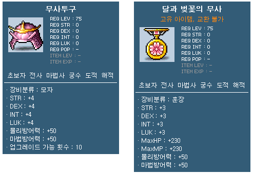 For completing this theme dungeon, you’ll receive the Samurai Helmet (4 to all stats, 50 defense and magic defense, 10 slots) and the Cherry Blossom Samurai medal (3 to all stats, 230 HP and MP, 50 defense and magic defense).