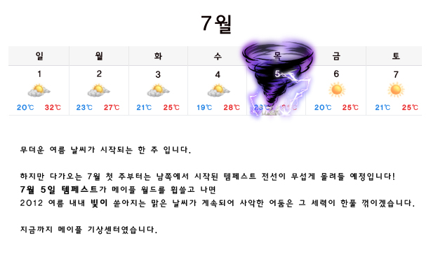 After the Tempest on July 5, Maple World’s 2012 summer’s bright light will continue to shine with the evil darkness defeated once again.For now, Maple weather center.