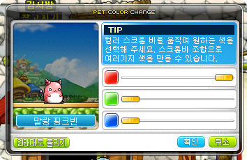 A new Pink Bean pet has been released, what makes this one unique (other than the attack bonuses for having it out, just like the Demon pets) is that its colour can be changed! After buying a Pet Color Change coupon in the Cash Shop, you can use the colour scrollers to change how your pet looks~