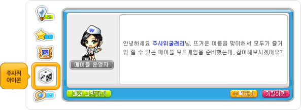 And now I’ll be talking about the events added in the real server! The first is called the Maple Board Game. Every 10 minutes, you can accept a quest from the Maple Admin to receive one Dice.