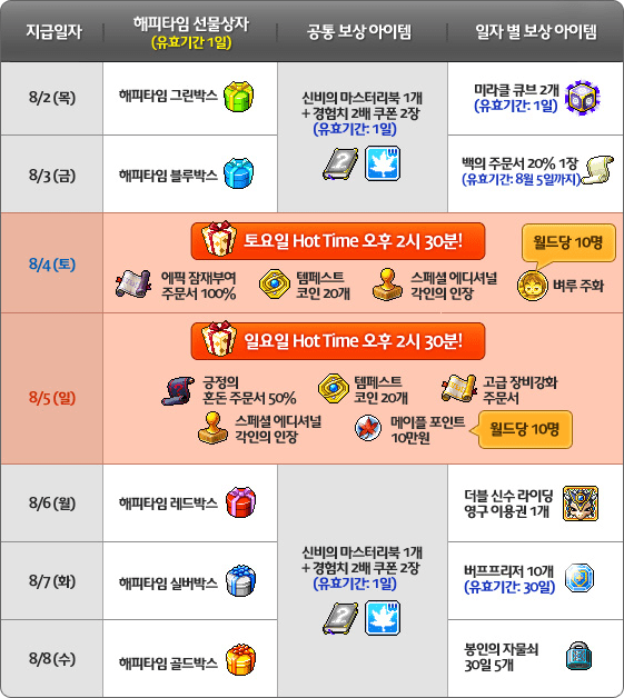 - 8/6: Happy Time Red Box (Mystery Mastery Book + 2 2x Experience Coupons + permanent Double Shinsoo Riding)