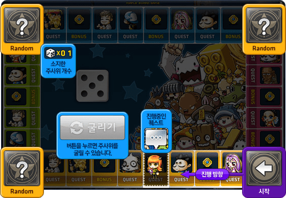 You can then roll your dice to move your character around the Maple Board Game. If you land on a Quest space, you must complete the task they tell you to (most of them are collecting items or killing monsters). You’ll then get a Bonus prize! If you land on a Bonus space, you’ll receive a Bonus prize for free~ On the Random space I believe you get a random quest or Bonus prize.
