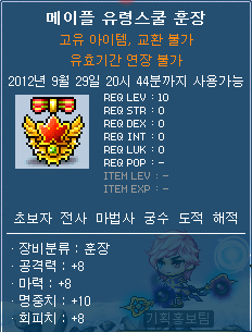 When you have finished all the chapter quests, you’ll receive the Maple Ghost School medal! It gives 8 attack and magic attack, 10 accuracy, and 8 avoid. It expires in 30 days (of course).