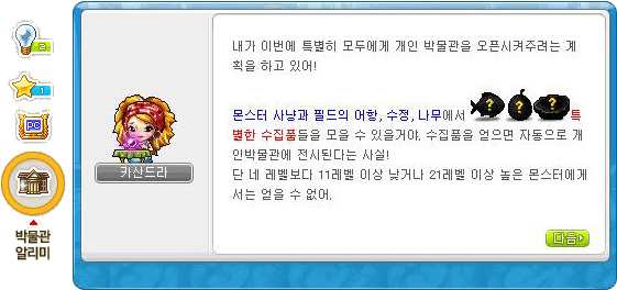 When you login, click the museum icon to begin. Cassandra will challenge you to become the Maple Museum King!