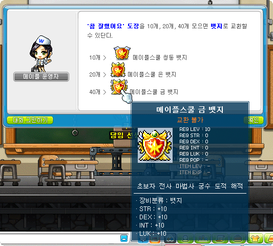 You can trade 10, 20, or 40 stamps for a Badge~ 10 gives you the Maple School Bronze Badge (5 to all stats), 20 gets you the Maple School Silver Badge (8 to all stats), and 40 gives you the Maple School Gold Badge (10 to all stats). The badges do expire, sadly.