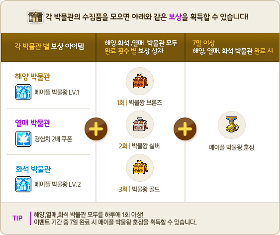 If you complete all three exhibits for 7 days, you’ll get the Maple Museum King medal, which gives 100 HP and MP, and 3 attack and magic attack.