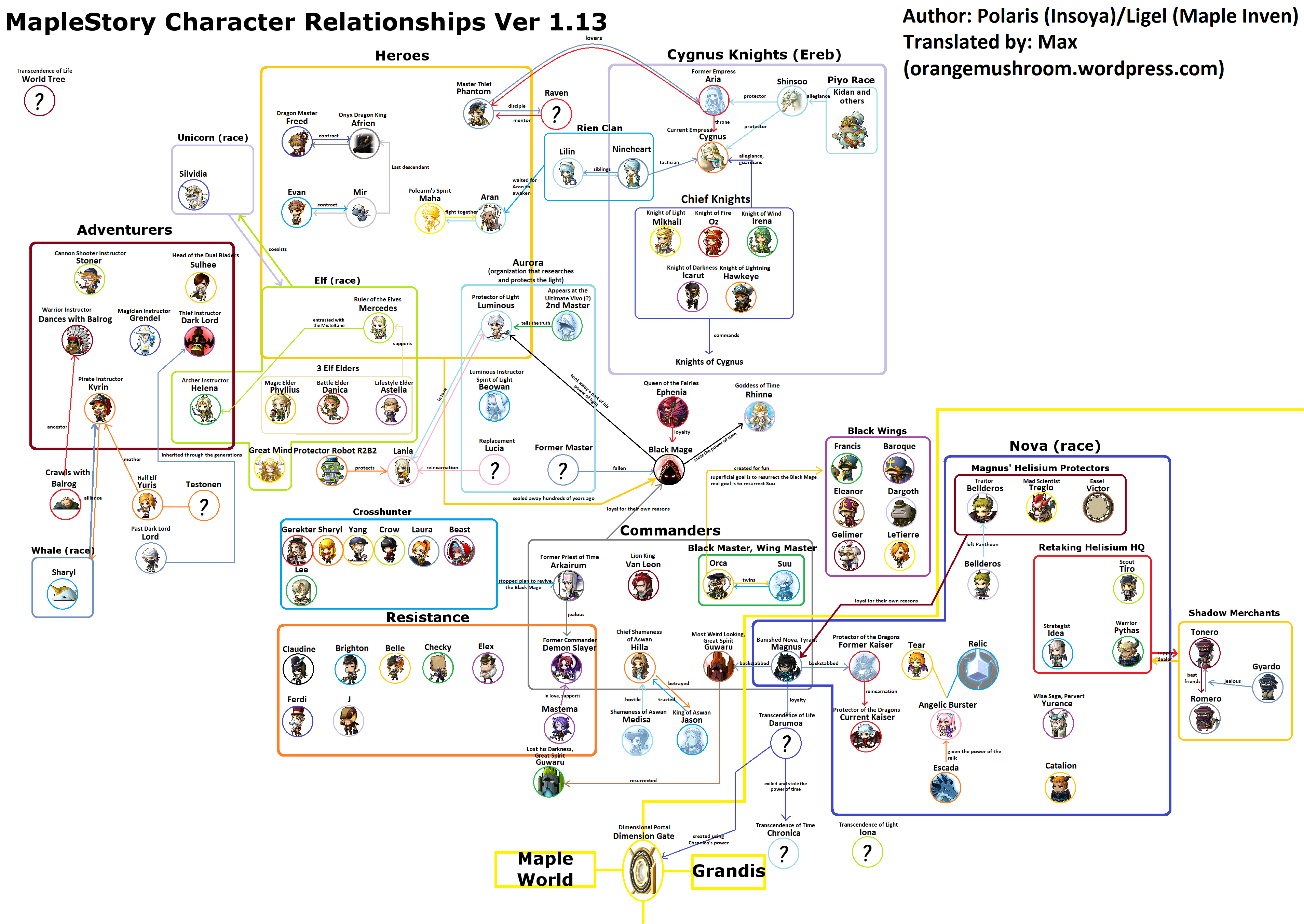 Here’s something I translated a while ago, posted by Polaris on Insoya.com (I think the thread got deleted or something…). It shows the relationships between various characters in MapleStory (no minor ones though like Chief Stan and Alex or Dr. Betty and Anne). Some are pretty interesting to see actually~
