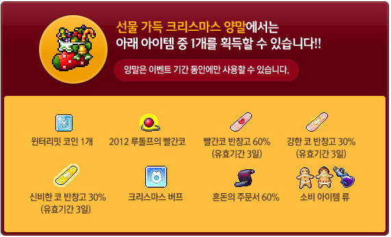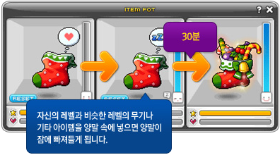 Christmas Socks will be dropping from monsters~ Raise them by giving them etc. items or equipment around your level to make them fall asleep. After 30 minutes, they’ll be turned into Gift Filled Christmas Socks!