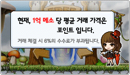 It seems that there will be a fluctuating price exchange. The above says that currently, 100 million mesos can be traded for ____ number of Points. There is also a 6% transaction fee. I wonder how they’ll determine the cost…
