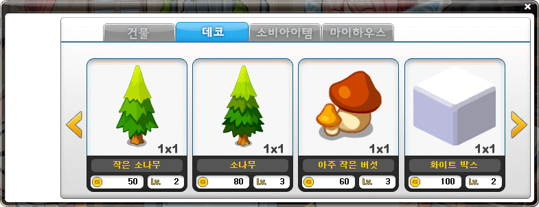 You can buy Buildings or Deco, to change the appearance of your farm. There are also Roads, which you get for free and have an infinite amount of.
