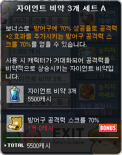 There’s also the 3 Giant Potions package, with Set A and B. It gives you 3 Giant Potions as well as a 70% Armor for Attack/Magic Attack scroll that gives 2 attack/magic attack if passed. It costs 5,500 NX.